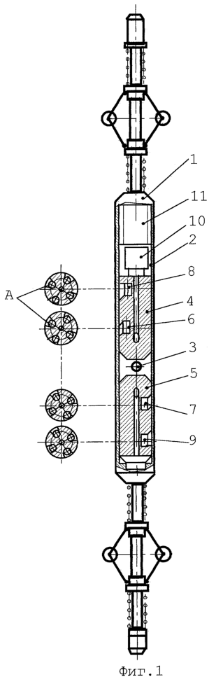 1. Устройство для исследования цементного кольца за обсадной колонной в скважине, содержащее корпус и неподвижный относительно корпуса экран с коллимационными окнами для источника и детекторов гамма-излучения; детекторы гамма-излучения, расположенные равномерно по периметру корпуса устройства на двух уровнях дальности относительно источника, соответствующих двум измерительным зондам – малому и большому и взаимоэкранированных, электронную схему, датчик углового положения, отличающееся тем, что парные детекторы гамма-излучения малого и большого зондов расположены по обе стороны от источника гамма-излучения, причем парные детекторы гамма-излучения малого и большого зондов, расположенные с одной стороны источника гамма-излучения, смещены в поперечном сечении относительно парных детекторов гамма-излучения малого и большого зондов, расположенных с другой стороны источника гамма-излучения, на угол, равный 360/N, где N – общее число парных детекторов малого и большого зондов; датчик углового положения жестко ориентирован в плоскости, проходящей через ось устройства и продольную ось одного из парных детекторов гамма-излучения малого и большого зондов, электронная схема снабжена телесистемой.