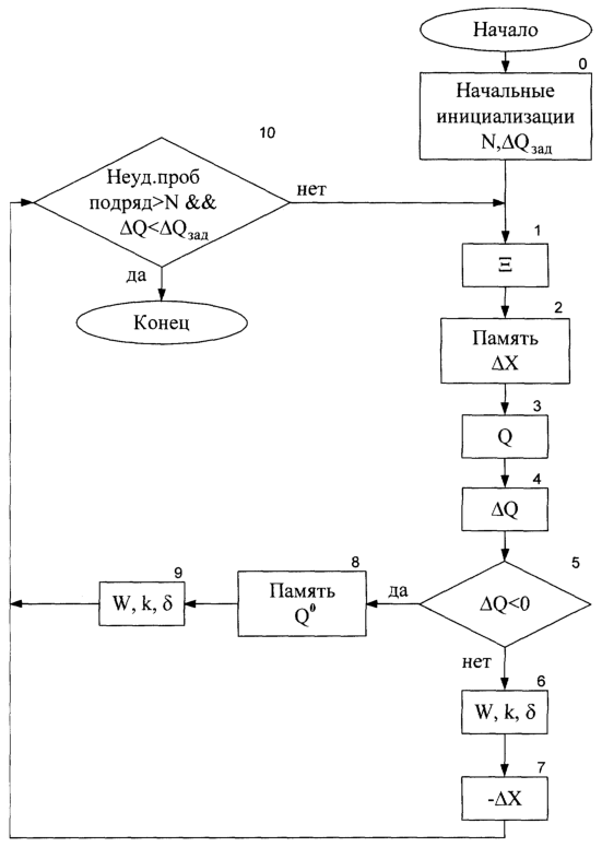 Блок-схема включает в себя: 0 – блок начальных инициализаций, 1 – блок формирования шага в случайном направлении в пространстве оптимизируемых параметров в соответствии с нормальным законом распределения, 2 – блок запоминания сформированного шага, 3 – блок определения значения функции качества в новой точке пространства оптимизируемых параметров, 4 – блок определения знака приращения функции качества, 5 – блок условия для удачного шага, 8 – блок запоминания значения функции качества при удачном шаге, 6 и 9 – блоки адаптации распределения направления поисковых шагов и интенсивности самообучения в процессе настройки, 7 – блок формирования шага в обратном направлении при неудачном шаге, 10 – блок условий для окончания оптимизации.