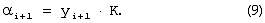 Сигналы, соответствующие параметрам А и В в соответствии с (2), задаются блоками 1 и 2 соответственно. Сигнал К (К>1) для обеспечения устойчивости процесса итерации определен (выставлен) в блоке 4, что обеспечивает в дальнейшем уменьшение числителя – на выходе блока 5 формируется сигнал . Соответственно, в дальнейшем восстановление выходного сигнала осуществляется посредством умножения уменьшенного сигнала у=yi+1 на (К·Кэк) в блоке 9 в соответствии с (9), т.е.
