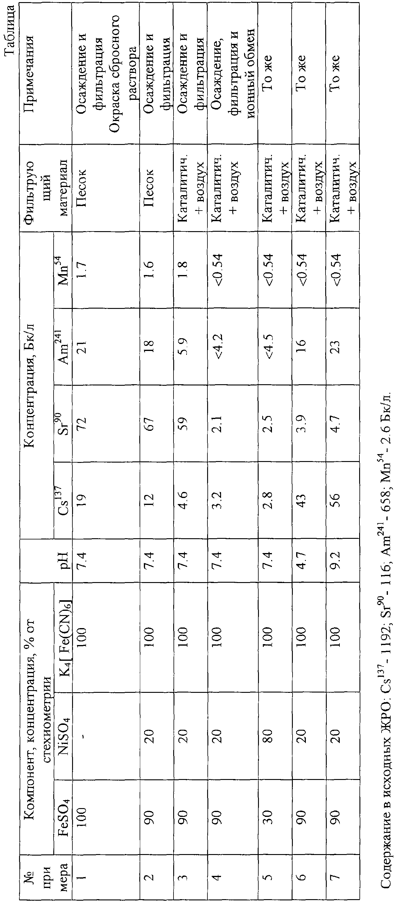 1. Способ очистки жидких радиоактивных отходов, включающий обработку их ферроцианидом тяжелого металла и отделение полученного осадка, отличающийся тем, что обработку жидких радиоактивных отходов осуществляют ферроцианидом тяжелого металла, образующегося при введении в жидкие радиоактивные отходы ферроцианида калия и двухвалентных солей никеля и/или меди и железа, взятого в избыточном от стехиометрического количестве, осветленный раствор после отделения осадка обрабатывают окислителем, например кислородом воздуха, и фильтруют через каталитический материал, содержащий двуокись марганца, а отфильтрованный раствор пропускают через сильнокислотный катионит в Na-форме и сильноосновный анионит в Cl-форме. 2. Способ по п.1, отличающийся тем, что двухвалентные соли никеля и/или меди вводят в жидкие радиоактивные отходы в количестве 0,1-0,8 стехиометрического, а количество двухвалентного железа подбирают таким образом, чтобы общее количество двухвалентных солей превышало стехиометрическое по отношению к ферроцианиду калия. 3. Способ по п.1, отличающийся тем, что обработку раствора жидких радиоактивных отходов осуществляют при рН 5,0-8,0. 4. Способ по п.1, отличающийся тем, что отфильтрованный раствор пропускают через послойно размещенные слои сильнокислотного катионита и сильноосновного анионита. 5. Способ по п.1, отличающийся тем, что отфильтрованный раствор пропускают через сильнокислотный катионит и сильноосновный анионит, предварительно обработанные раствором хлорида натрия.
