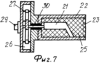 Очевидным недостатком применения последовательного делителя является нежелательное подсканирование антенны в азимутальной плоскости. От этого недостатка свободен второй вариант линейного излучателя, приведенный на фиг.6-7. В качестве делителя мощности в нем используется полосковый ДМ с параллельными разветвителями тройникового типа. Он состоит из плоского корпуса 26, внутри которого на диэлектрических опорах 27 размещена разветвляющаяся по схеме «симметричная елочка» – система проводников 28 прямоугольного (или круглого) сечения. Коаксиальные вход 29 и выходы 30 выведены соответственно через крышку и дно корпуса в противоположные стороны. Коэффициент деления мощности в точках разветвления и его согласование обеспечиваются выбором волновых сопротивлений четвертьволновых трансформаторов 31. Поперечное сечение излучающей линейки с использованием параллельного ДМ и волновода с излучающими окнами приведено на фиг.7.