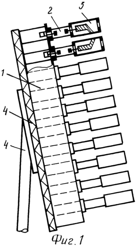 Конструкция предлагаемой двухподдиапазонной антенной решетки с частотным сканированием, приведенная на фиг.1, состоит из сканирующего делителя мощности 1 и системы линейных излучателей, состоящих из полоскового делителя мощности 2 и излучающего волновода 3, а также фермы 4.