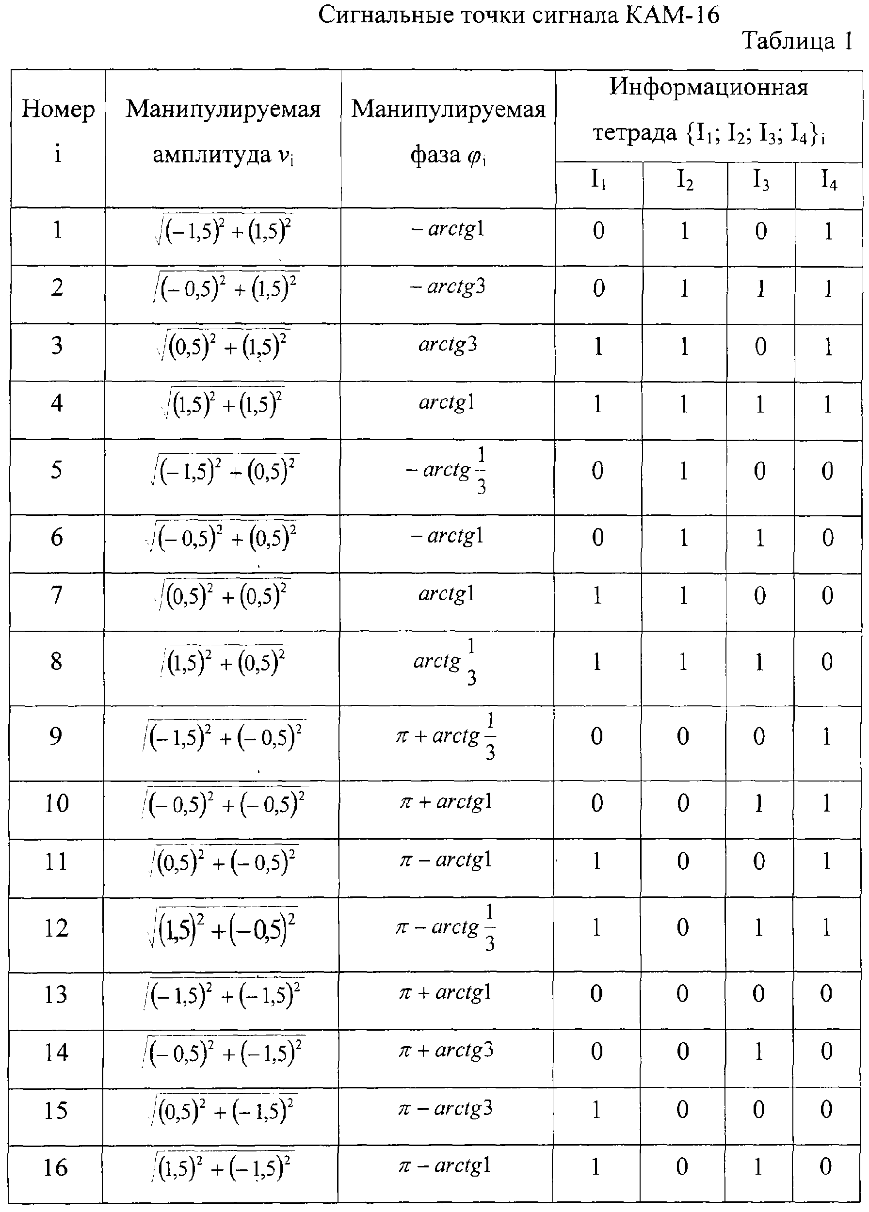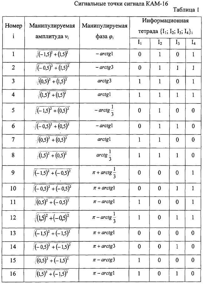 При этом соотношение между номером сигнальной точки, манипулируемой амплитудой Ui, манипулируемой фазой i и передаваемой информационной тетрадой битов {I1, I2, I3, I4}i приведено в таблице 1.