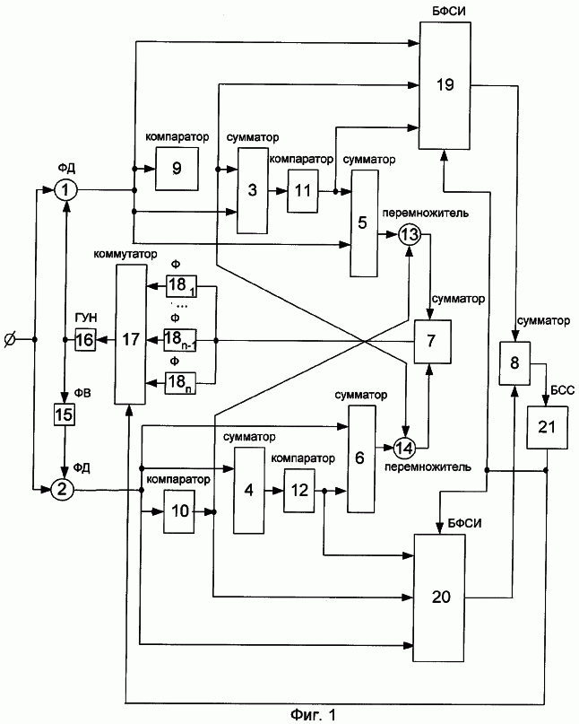 Устройство содержит первый и второй фазовые детекторы (ФД) 1 и 2, первый – шестой сумматоры 3-8, первый – четвертый компараторы 9-12, первый и второй перемножители 13 и 14, фазовращатель 15 на 90°, генератор 16, управляемый напряжением, коммутатор 17, n фильтров 181-18n, первый и второй БФСИ 19 и 20, блок счета и сравнения (БСС) 21.