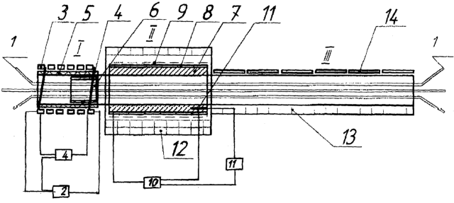 Блок догрева или охлаждения II пучка проволоки 1 представляет собой муфельную печь, нагревательным элементом которой является муфельная трубка 7, на поверхности которой, отделенные от нее трубкой из электроизоляционного материала 8, размещены в виде спирали тепловыделяющие элементы 9. Тепловыделяющие элементы 9 соединены с дополнительным источником питания 10, основные параметры которого: частота питающего тока, мощность и тому подобное могут отличаться от аналогичных параметров источника питания блока индукционного нагрева I. Температура проволоки 1 в блоке догрева или охлаждения фиксируется системой автоматического регулирования и контроля 11. Муфельная печь с целью снижения тепловых потерь снабжена футеровкой 12.