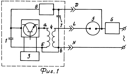Устройство содержит (фиг.1) рабочий конденсатор 1, присоединенный через коммутирующий элемент 2, отпираемый от блока управления 3, параллельно первичной обмотке импульсного трансформатора 4. Цепь, состоящая из последовательно соединенных вторичной обмотки импульсного трансформатора 4 и лампы 5, включена в сеть непосредственно или через ограничитель тока 6. Шунтирующий конденсатор 7 подключен через лампу 5 параллельно вторичной обмотке импульсного трансформатора 4. Рабочий конденсатор 1 подключен через токоограничивающий элемент 8 параллельно шунтирующему конденсатору 7. L, D, N – контакты, подключающие устройство для зажигания газоразрядных ламп (обведено пунктиром) к газоразрядной лампе и сети. Возможно соединение между собой выводов а и в импульсного трансформатора 4 при одновременном разрыве соединения между выводами б и в. Для некоторых типов ламп ограничитель тока 6 может быть исключен. В устройстве по п.2 (фиг.2) в качестве коммутирующего элемента 2 использован транзистор с включенным между коллектором и эмиттером защитным полупроводниковым диодом, а токоограничивающий элемент 8 состоит из последовательно включенных резистора и полупроводникового диода. В устройстве по п.3 (фиг.З) в качестве коммутирующего элемента 2 использован выпрямительный мост с транзистором в диагонали.