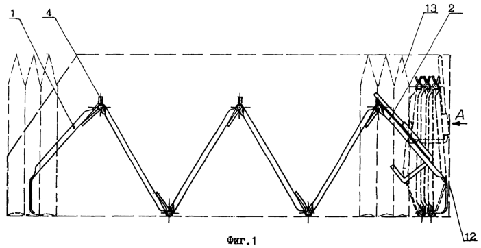 Устройство снабжено ограничителем разжатия пластин, выполненным в виде отогнутых верхних концов 4 пластин каждой пары, выходящих за оси соответствующих шарниров, соединяющих каждую пару пластин. При этом концы смежных пластин отогнуты в противоположные стороны по отношению друг к другу. На верхней стороне задней пластины смонтирован фиксатор 5 (фиг.2), который может удерживать устройство в сжатом состоянии.