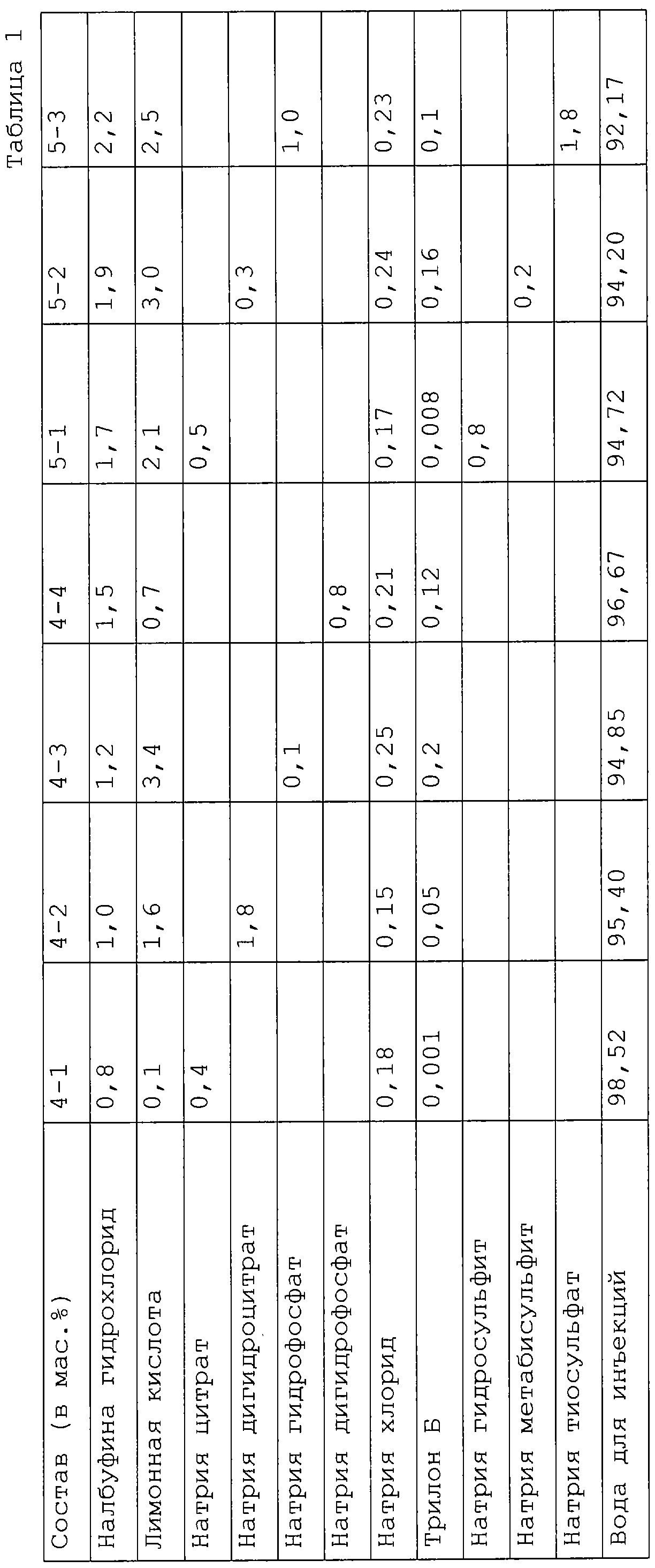 Группа изобретений относится к медицине, в частности, к фармакологии – к растворам для инъекций на основе налфубина гидрохлорида, обладающим ярко выраженным анальгетическим действием, и способам их получения. Группа изобретений может найти применение для устранения болевых синдромов средней и выраженной интенсивности при инфаркте миокарда, при подготовке к операции (профилактика) и в послеоперационном периоде, а также в качестве дополнительного средства обезболивания при общей анестезии. Налфубина гидрохлорид (химическое название: (5 альфа, 6 альфа)-17-(Циклобутилметил)-4,5-эпоксиморфинан-3,6,14-триол) относится к фармакологической группе опиоидов и является производным морфина, однако характерной особенностью его молекулы является наличие метилциклобутильного радикала. Фармакологическое действие – анальгезирующее (наркотическое). Обладает свойствами агониста-антагониста опиатных рецепторов. Угнетает ЦНС, оказывает анальгезирующее, снотворное, противокашлевое действие. Возбуждает мю-рецепторы и блокирует каппа-рецепторы. Наиболее близкий раствор для инъекций, обладающий выраженным анальгетическим действием, раскрыт в “Инструкции по медицинскому применению препарата НУБАИН (Nubain)” (одобрено Фармакологическим государственным комитетом Минздрава России 12 ноября 1998, протокол №9-1). Раствор для инъекций содержит 10 мг налфубина гидрохлорида в 1 мл раствора и вспомогательные вещества: буферные вещества (лимонную кислоту и цитрат натрия водный), стабилизаторы (хлорид натрия) и воду для инъекций. Налфубина гидрохлорид представляет собой белый или почти белый кристаллический порошок, растворимый в воде. Известный раствор налфубина устойчив в слабокислой среде, однако при повышении рН выше 6 две молекулы налфубина реагируют между собой с образованием бисмалбуфина. Интенсивность этого процесса возрастает при повышении температуры, под воздействием света и в присутствии ионов тяжелых металлов, что приводит к потере устойчивости лекарственной формы в течение срока годности препарата. Задачей изобретения является получение отечественного препарата с сильным анальгезирующим действием, соответствующего требованиям ГФ XI, стабильного при хранении более 2,5 лет. Поставленная задача решается раствором для инъекций, обладающим выраженным анальгетическим действием, содержащим налбуфина гидрохлорид, буферную смесь, стабилизатор и воду для инъекций, при этом раствор дополнительно содержит комплексообразующий компонент при следующем соотношении, мас.%: Налбуфина гидрохлорид 0,8-2,2 Буферная смесь 0,5-3,5 Стабилизатор 0,15-0,25 Комплексообразующий компонент 0,001-0,2 Вода Остальное В частных воплощениях изобретения поставленная задача решается тем, что: в качестве комплексообразующего компонента раствор может содержать динатриевую соль этилендиаминтетрауксусной кислоты (трилон Б) или другой известный комплексообразователь, например, тетацин кальция; в качестве буферной смеси он может содержать смесь лимонной кислоты и, по меньшей мере, одного вещества, выбранного из группы, включающей натрия цитрат, натрия дигидроцитрат, натрия гидрофосфат, натрия дигидрофосфат или кристаллогидраты упомянутых веществ; упомянутая смесь может содержать 0,1-3,4 мас.% кислоты лимонной, в качестве стабилизатора раствор может содержать натрия хлорид,