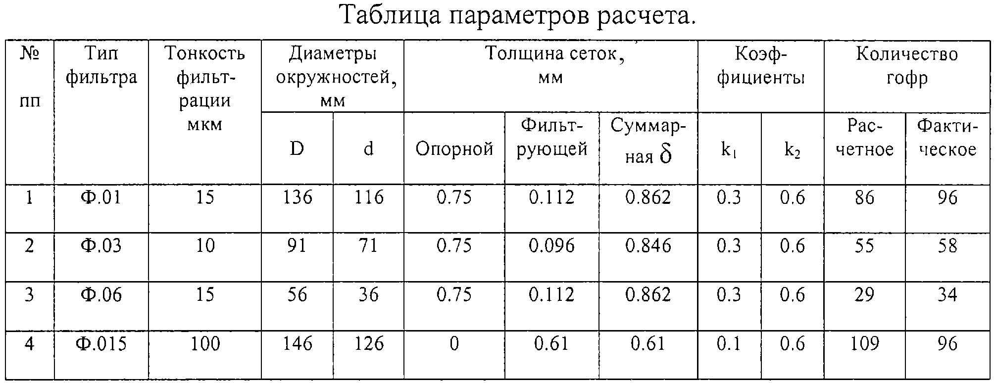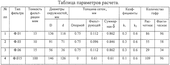 Экспериментально найдено оптимальное значение коэффициента плотности гофрирования, с точки зрения обеспечения минимального гидравлического сопротивления фильтрующей поверхности фильтра, определяемое соотношением k1=0,1÷ 0,3. При выходе значения k1 за крайние пределы указанного соотношения ресурс фильтра при прочих равных условиях снижается.