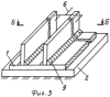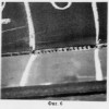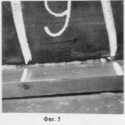 Глубина проплавления прихваток в углу таврового соединения составляет 2,5-3 мм, что достаточно для надежной фиксации ребер относительно настильного листа ортотропной плиты. Выполняющие операции прихватки элементов ортотропной плиты неплавящимся вольфрамовым электродом без присадки обусловливает как внутреннее их проплавление без образования наружных швов (фиг.3), что обеспечивает в дальнейшем при проведении окончательной сварки плавящимся электродом под слоем флюса равномерность и высокое качество таврового соединения, т.е. в этом случае нет необходимости иметь сложную систему, отслеживающую начало и конец прихваточного шва, а следовательно, постоянно изменять режимы сварки. Величина катета сварного шва составляет в пределах 6-8 мм (фиг.4).