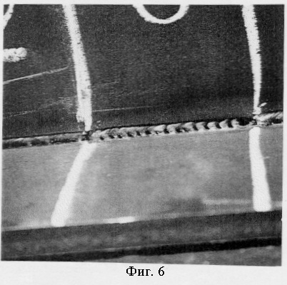 Сварка тавровых соединений низколегированных и углеродистых сталей большой толщины вольфрамовым электродом без присадки с защитой аргоном невозможна из-за плохого формирования шва, характеризующегося цепочкой свищей по всему шву (фиг.6). Сварка же в смеси газов Аr+СO2 при содержании СO2 более 5% приводит к повышению эрозии вольфрамового электрода.