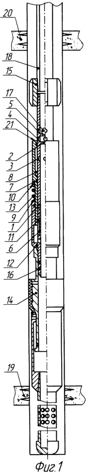 Устройство состоит из корпуса 1 (фиг.1), снабженного глухой перегородкой 2 и тремя рядами радиальных каналов, один из которых 3 находится ниже глухой перегородки, а два других 4 и 5 – выше. В нижней части корпуса 1 на наружной поверхности выполнен фигурный паз 6 (фиг.2). На корпус 1 телескопически надет подвижный патрубок 7 с кольцевой выборкой 8, образующей с корпусом кольцевую камеру и имеющий в нижней части цилиндрическую расточку 9 с кольцевым уступом 10. Фиксирующий штифт 11 одним концом жестко соединен с подвижным патрубком 7, а другим – взаимодействует с фигурным пазом 6. Подвижный патрубок 7 частично входит в ступенчатый цилиндр 12, который соединен с корпусом 1. В цилиндрической расточке 9 между торцом 10 и верхним торцом цилиндра 12 расположена пружина 13. Нижний конец цилиндра 12 входит внутрь корпуса пакера 14. В верхней части корпуса установлен центратор 15. Сопрягаемые поверхности деталей снабжены уплотнительными кольцами 16. В центральном канале корпуса 1 между рядами 4 и 5 радиальных каналов находится обратный клапан 17.