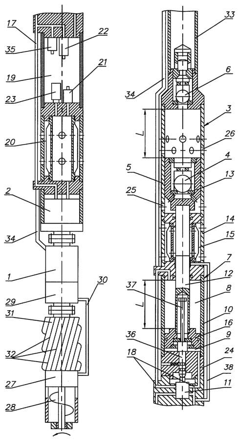Привод шнекового насоса 28 осуществляется дополнительным гидродвигателем 27, вал которого жестко связан со шнековьм насосом 28. Дополнительный гидродвигатель 27 соединен с гидроредуктором 29, установленным на нижнем конце погружного электродвигателя 1 и соединенного с дополнительным гидродвигателем 27 трубопроводом 30.