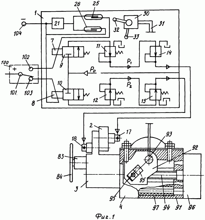 На Фиг.1 обозначены также: задающее устройство 100 и клеммы 101 – плюсовая, 102, 103 и 104 – минусовая (в состав привода не входят); Р – давление управляющего газа (рабочей среды); P1, Р2 – давление газа на выходах регуляторов давления и регуляторов расхода газа соответственно.