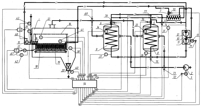 Схема способа автоматического управления процессом вакуум-сублимационной сушки по принципу теплового насоса включает также линию 21 подачи замороженного продукта в сушильную камеру 1, линию 22 удаления сухого продукта из сушильной камеры 1, линию 23 подачи горячего хладагента в трубки змеевика 18, линию 24 отвода хладагента из трубок змеевика 18, линию 25 подачи хладагента в теплообменник 4, линию 26 хладагента, предназначенного для снижения температуры между первой 11 и второй 12 ступенью компрессора 10, линию 27 переохлажденного хладагента, подаваемого в десублиматоры 8 и 9 через терморегулирующие вентили 5 и 6, линию 28 отвода хладагента из десублиматоров 8 и 9 и подачи его в компрессор 10, линию 29 подачи горячего хладагента из компрессора 10 в десублиматоры 8 и 9 для их регенерации, линию 30 удаления из сушильной камеры 1 парогазовой смеси, линию 31 удаления из десублиматоров 8 и 9 воздуха и неконденсирующихся газов, датчики давления 32, 33, 34, датчики температуры 35, 36, 37, 38 соответственно горячего хладагента на выходе из компрессора 10, хладагента на выходе из десублиматоров 8, 9, сухого продукта на выходе из барабана 16, датчики 39, 40 влажности продукта соответственно на входе и выходе из сушилки, датчик 41 степени заполнения барабана 16, датчик 42 частоты вращения барабана 16, датчик 43 расхода продукта в линии 21, вторичные приборы 44-53, микропроцессор 54, цифроаналоговые преобразователи 55-66, исполнительные механизмы 67-78.