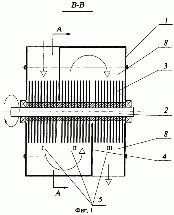 Изобретение поясняется чертежами. На фиг.1 представлен продольный разрез дискового теплообменника в сечении В-В. На фиг.2 показан поперечный разрез теплообменника в сечении А-А.
