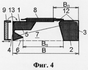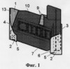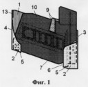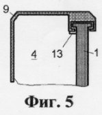 По др. конструктивному варианту (см. фиг.3, 5), накидной фиксатор 9 выполнен Г-образным во фронтальной и П-образным в боковой проекциях, из полужесткого, например полимерного, материала и установлен на верхней кромке стенки 1, выполненной, в свою очередь, в виде Т-образной в продольном сечении направляющей (см. фиг.5), с возможностью принудительного перемещения фиксатора 9 по указанной направляющей до ограничителя (упора) 13, предусмотренного в конце кромки (т.е. на углу корпуса). В частности, упором 13 может служить сама стенка 4. В этом случае основание фиксатора 9 монтируют на Т-образной направляющей не сбоку, а сверху, деформируя тело основания (обычный способ для пластмассовых сборок).
