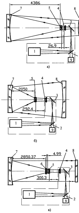В приведенных схемах перестройка фокусировки рабочей ветви осуществляется при помощи взаимного перемещения базового блока и компенсатора вдоль оптической оси стационарно закрепленного сферического зеркала. Расчетные расстояния между базовым блоком, компенсатором и сферическим зеркалом приведены на чертеже. При этом величина сферической аберрации волнового фронта формируемого крупногабаритным зеркалам будет значительной. Для компенсации сферической аберрации зеркала рассчитаны два линзовых компенсатора. При расчете компенсаторов использовался метод компенсации аберраций нормалей поверхностей (Пуряев Д.Т. Методы контроля оптических асферических поверхностей. М.: Машиностроение, 1976).