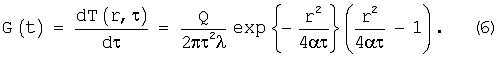На фиг.2 приведены расчетные графики изменения значений температуры и ее дифференциальных интегрированных по времени значений при Q=40 Дж; =5·10-7 м2/c; =0,5 Bт/м·K; r=2,5·10-3 м; k=1.