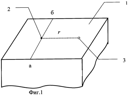 На фиг.1 показана схема реализации предлагаемого способа. На теплоизолированной поверхности исследуемого материала 1 помещают линейный импульсный источник тепла 2, выделяющий количество тепла по линии а-б, равное Q. На расстоянии r от источника тепла располагают термодатчик 3. После подачи теплового импульса в заданной точке контроля поверхности исследуемого материала фиксируют дифференциальное по времени значение температуры, интегрированное по времени значение температуры и ее абсолютное значение до момента наступления заранее заданного соотношения.