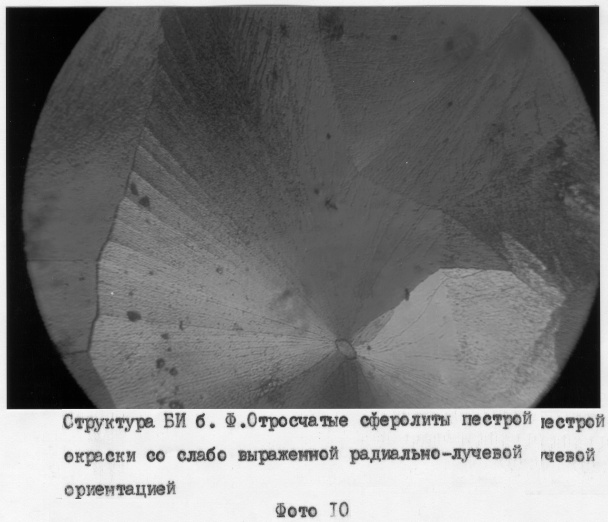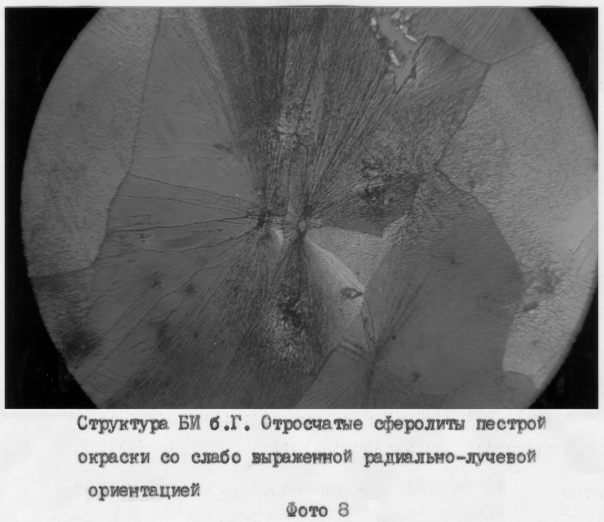 Пример 5, фиг.8. Б-ой Г. ИБ №94. Диагноз: ХП в фазе ремиссии. На фиг.8 присутствуют пестрой окраски отросчатые сферолиты со слабо выраженной радиально-лучевой ориентацией.