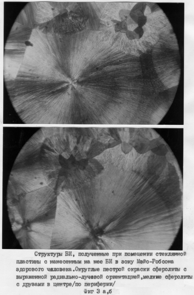 На фиг.3а,б приведена структура БИ, полученная при помещении стеклянной пластины с нанесенным на нее БИ на зону проекции поджелудочной железы здорового человека. Пластину выдержали в зоне Мэйо-Робсона на протяжении 2 мин, высушили в термостате при Т=+18°С на протяжении 3 мин и исследовали в поляризованном свете. Присутствуют округлые сферолиты пестрой окраски с выраженной радиально-лучевой ориентацией, видны мелкие сферолиты с друзами в центре. При исследовании проведено 328 экспериментов.