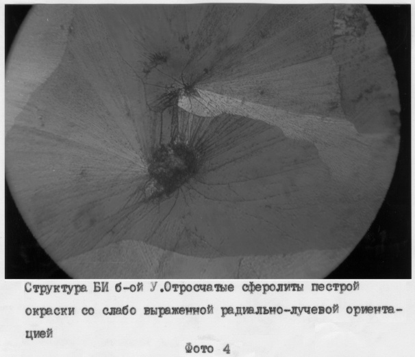 Пример 1, фиг.4. Б-ой У. Диагноз: хронический панкреатит (ХП) в стадии ремиссии. История болезни (ИБ) №218. На фиг.4 приведена структура БИ, полученная при помещении стеклянной пластины с БИ в зону Мэйо-Робсона, присутствуют отросчатые сферолиты пестрой окраски со слабо выраженной радиально-лучевой ориентацией.