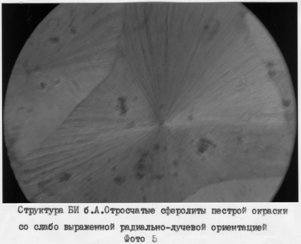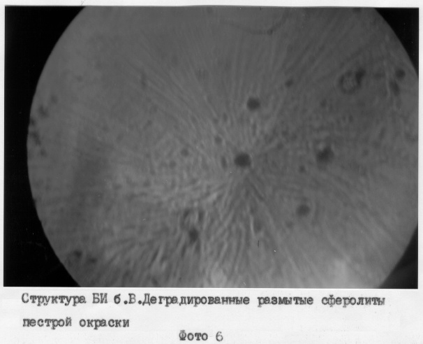 Пример 2, фиг.5. Б-ой А. Диагноз: хронический панкреатит (ХП) в стадии ремиссии. ИБ №209. На фиг.5 приведена структура БИ, полученная при помещении стеклянной пластины с нанесенным на нее БИ в зону Мэйо-Робсона, видны отросчатые сферолиты пестрой окраски со слабо выраженной радиально-лучевой ориентацией.