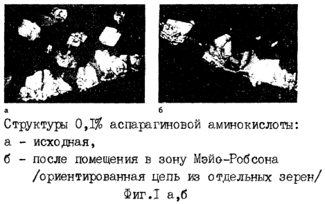 На фиг.1а приведена исходная структура 0,1% водного раствора аспарагиновой аминокислоты, входящей в состав разработанного нами БИ, видны отдельные зерна. При помещении стеклянной пластины с нанесенным на нее 0,1% раствором аспарагиновой кислоты в зону Мэйо-Робсона здорового человека (левый реберно-позвоночный угол) появилась новая структура, фиг.1б, видна ориентированная цепь из отдельных, сливающихся между собой, зерен.
