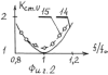 Первая была исполнена в коаксиальном варианте согласно фиг.1. Для реализации отрезка коаксиальной линии 1 и четвертьволнового шлейфа 3 использовался стандартный 75-омный коаксиальный кабель типа РК-75-7-22, а отрезок симметричной двухпроводной линии 2 был выполнен из стандартного кабеля РД-75-3-12. Проводники 12, 13 симметричного вибратора выполнялись из медного посеребренного провода диаметром 2 мм. Центральная частота f0 рабочего диапазона составила 300 МГц, так что длина четвертьволновых проводников 12, 13 равна 0/4=250 мм. Расстояние между клеммами 10, 11 вибратора выбрано равным расстоянию между жилами симметричного кабеля РД-75-3-12. Длина разомкнутого четвертьволнового коаксиального шлейфа 3 из кабеля РК-75-7-22 зависит от относительной диэлектрической проницаемости его диэлектрика rk, равной 2,3, и составила 0/(4 )=165 мм. Результаты экспериментальной частотной характеристики входного Кcт.u изготовленного симметрирующего устройства (фиг.2, поз. 15) находятся в хорошем соответствии с теоретическим расчетом (фиг.2, поз. 14), выполненным для нормированных значений параметров.