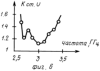 Второй была изготовлена интегрированная конструкция печатного варианта заявляемого симметрирующего устройства и печатного вибратора с топологией и размерами согласно фиг.3. Это изделие было использовано в качестве облучателя длиннофокусной зеркальной параболической антенны с центральной частотой f0=З ГГц, эскиз которой представлен на фиг.4. Облучатель фиксировался в фокусе зеркала двумя металлическими штангами, вдоль одной из которых (нижней на фиг.4) был проложен коаксиальный 75-омный питающий кабель типа РК-75-2-22. Известно, см., например, работу: Драбкин А.Л., Зузенко В.Л., Кислов А.Г. “Антенно-фидерные устройства”, М.: Советское радио, 1974, глава XVI, что уровень поперечно-поляризованного (кросс-поляризованного) излучения зеркальной параболической антенны существенно зависит от степени симметрирования плеч вибратора-облучателя, и он тем больше, чем хуже симметрирован вибратор-облучатель. Поэтому, если экспериментально снять поляризационную диаграмму зеркальной параболической антенны с таким облучателем по методике, изложенной в р. XX. 5 только что названной работы, то по этой диаграмме можно с уверенностью судить о равномерности возбуждения проводников 18, 19 печатного вибратора (фиг.3) и, следовательно, о качестве симметрирования печатной версии заявляемого симметрирующего устройства. Поляризационная диаграмма была измерена с использованием генератора сигналов ГЗ-22, питающего облучатель зеркальной параболической антенны на частоте f0=3 ГГц, приемного пирамидального рупора с линейной поляризацией, милливольтметра ВЗ-38 и приведена на фиг.5. Вид поляризационной диаграммы – строгая “восьмерка” свидетельствует о пренебрежимо малом уровне кросс-поляризационного излучения зеркальной параболической антенны с упомянутым печатным облучателем, находящимся на уровне не более – 20 дБ. Последнее означает достаточно высокую степень симметрии (пренебрежимо малую степень несимметрии) возбуждения проводников 18, 19 печатного вибратора и, следовательно, высокое качество симметрирования печатного варианта заявляемого симметрирующего устройства. Кроме того, на фиг.6 представлена экспериментальная частотная характеристика входного Кcт.u коаксиального кабеля РК-75-2-22, питающего печатный облучатель, которая подтверждает возможность достижения 23-процентной относительной полосы частот по уровню Кcт.u=1,5. В результате печатная версия заявляемого симметрирующего устройства превосходит прототип по широкополосности согласования и симметрирования более чем в 2 раза и может быть использована для питания как симметричных печатных облучателей, так и самостоятельно используемых печатных симметричных вибраторов в составе многоэлементных одночастотных или совмещенных многочастотных фазированных антенных решеток.
