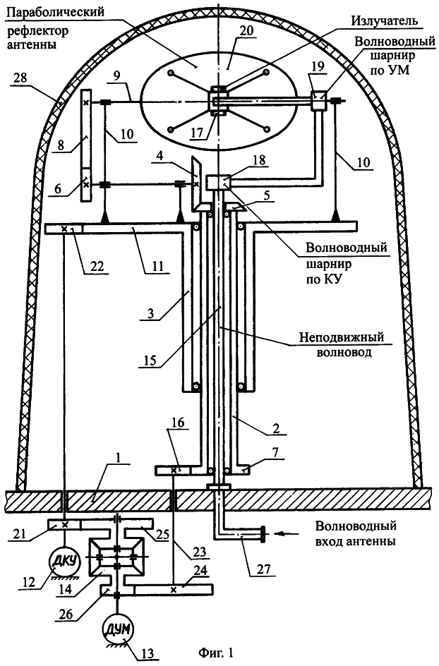 На неподвижном основании 1 закреплен неподвижный волновод 15, имеющий волноводный вход антенны 27 для подведения энергии к излучателю 17. Вокруг волновода 15 на подшипниках вращается полый вал 2, на торцах которого закреплены шестеренки 5, 7. Посредством шестеренок 4, 5, 6 приводится во вращение сектор 8, закрепленный на оси 9 вращения антенны по УМ. Шестеренка 7 посредством шестеренок 16, 24 и оси 23, пропущенной через неподвижное основание 1, кинематически связана с входной шестеренкой 26 шестеренчатого дифференциала 14. Соосно с полым валом 2 в противоположную сторону вращается полый вал 3, жестко соединенный со столом 11, торцевая часть которого выполнена в виде шестеренки. На столе закреплены стойки 10 с осью вращения антенны по углу места УМ 9. Стол вращается посредством двигателя 12 привода курсового угла через шестеренку 22. Двигатели 12, 13 расположены на нижней части неподвижного основания 1 и соединены между собой кинематически шестеренчатым дифференциалом 14. Соединение неподвижного волновода 15 с излучателем антенны 17 осуществляется посредством волноводных шарниров по курсовому углу 18 и по углу места 19. Устройство дополнительно снабжено защитным радиопрозрачным колпаком 28, расположенным на верхней части неподвижного основания 1. Такая схема позволяет при вращении стола двигателем курсового угла КУ и вращением привода угла места УМ в обратном направлении держать ось 9 угла места антенны в неподвижном состоянии или, меняя скорость вращения двигателя 13 угла места, в ту или другую сторону поворачивать антенну по углу места при вращении стола по курсовому углу.