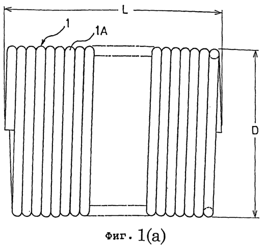 Упомянутая выше катушка 1 обеспечена таким свойством, что металлический провод 1а пластично деформируется, когда катушка удлиняется от ее неудлиненной величины L. Более конкретно, при удлинении катушки в 10 или более раз относительно ее не удлиненной величины L катушка 1 сокращается от диаметра D и, в то же время, она пластично деформируется так, что длина после удлинения сохраняется. Если этот металлический провод 1а деформируется при удлинении меньше, чем в 10 раз от его неудлиненной величины L, становится трудно удлинить катушку 1 таким образом, чтобы сохранить шаг спирали с постоянным интервалом.