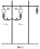 Предположим, что на фазный провод 23 с отложениями с некоторой силой дует ветер слева направо поперек оси визирования воздушной линии электропередачи, как показано на фиг.3, то ось гирлянды изоляторов 22 отклоняется в положение 22′, а положение оси гирлянды изоляторов 27 практически не изменяется, так как ветровая нагрузка на фазный провод 26, закрепленный на гирлянде изоляторов 27, уравновешивается тяжением натянутой силой ветра шарнирно соединенной изоляционной распорки 25. (В действительности в начале действия ветра гирлянда изоляторов 27 отклоняется на небольшой угол, распорка 25 натягивается и гирлянда фиксируется в положении, близком к вертикальному – этим объясняется наличие “мертвой” зоны в измерителе). Сигнал на выходе силоизмерительного датчика 1 будет пропорционален гололедно-ветровой нагрузке, равной корню квадратному из суммы квадрата гололедной нагрузки (вместе с суммарным весом гирлянды изоляторов и пролета фазного провода) и квадрата ветровой нагрузки, а сигнал на выходе силоизмерительного датчика 2 будет пропорциональным только гололедной нагрузке (вместе с суммарным весом гирлянды изоляторов и пролета фазного провода). И, наоборот, если на фазный провод 26 с отложениями на нем ветер дует справа налево поперек оси визирования воздушной линии электропередачи, как показано на фиг.3, то ось гирлянды изоляторов 27 отклоняется в положение 27′, а положение оси гирлянды изоляторов 22 практически не изменяется, так как ветровая нагрузка на фазный провод 23, закрепленный на гирлянде изоляторов 22, уравновешивается тяжением шарнирно соединенной изоляционной распорки 24. Сигнал на выходе силоизмерительного датчика 2 будет пропорционален суммарной гололедно-ветровой нагрузке, равной корню квадратному из суммы квадрата гололедной нагрузки (вместе с суммарным весом гирлянды изоляторов и пролета фазного провода) и квадрата ветровой нагрузки, а сигнал на выходе силоизмерительного датчика 1 будет пропорциональным только гололедной нагрузке (вместе с суммарным весом гирлянды изоляторов и пролета фазного провода).