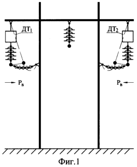 2. Устройство по п.1, отличающееся тем, что на П-образной промежуточной опоре первый силоизмерительный датчик с гирляндой изоляторов и первым фазным проводом подвешен на первом конце горизонтальной траверсы опоры, а второй силоизмерительный датчик с гирляндой изоляторов и третьим фазным проводом подвешен на противоположном конце той же горизонтальной траверсы, причем нижний конец гирлянды изоляторов с фазным проводом и первым силоизмерительным датчиком через горизонтальную шарнирную изоляционную распорку прикреплен справа к первой стойке П-образной опоры, а нижний конец гирлянды изоляторов с фазным проводом и вторым силоизмерительным датчиком через горизонтальную шарнирную изоляционную распорку прикреплен слева ко второй стойке П-образной опоры.