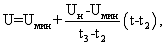 Зависимость напряжения Uвых и тока в силовой цепи Iвых от времени для реального устройства управления преобразователем постоянного напряжения =110 В в переменное ~220 В, 50 Гц, с выхода которого происходило питание электропривода бытового холодильника, показана на фиг.2. На интервалах времени 0-t1 и t3-t4 задатчик требуемого напряжения формирует сигнал, пропорциональный номинальному напряжению Uн, на интервале t1-t2 формирует сигнал, пропорциональный минимальному напряжению Uмин, на интервале t2-t3 формирует переменный сигнал, пропорциональный текущему значению выходного напряжения U: