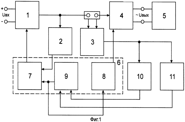 Как показано на фиг.1, устройство для управления преобразователем постоянного напряжения в переменное содержит управляемый преобразователь постоянного напряжения в повышенное постоянное 1, датчик напряжения 2, включенный в силовую цепь датчик тока 3, инвертор 4, к выходу которого подключен асинхронный двигатель 5 с пускозащитным устройством, управляющее устройство 6, которое может быть выполнено на базе микропроцессора и в состав которого входят регулятор напряжения 7, регулятор частоты 8 и задатчик требуемого напряжения 9, первый пороговый элемент 10, второй пороговый элемент 11.