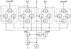 1. Многоканальный синтезатор сетки частот, характеризующийся тем, что он содержит синтезатор частоты, генератор, первый и второй смесители, линейный набор n-1 (где n=3, 5, 7… – нечетные числа) идентичных модулей, каждый из которых содержит первый и второй аналоговые перемножители, первый фазовращатель на /2 и сумматор, при этом в каждом из n-1 идентичных модулей первый вход первого перемножителя и вход первого фазовращателя на /2 объединены и являются опорным входом модуля, выход первого фазовращателя на /2 соединен с первым входом второго перемножителя, выходы первого и второго перемножителей подключены соответственно к первому и второму входам сумматора, выход которого является выходом модуля, а вторые входы первого и второго перемножителей являются соответственно первым и вторым квадратурными входами модуля; выход генератора соединен с опорными входами первых модулей справа и слева от центра линейного набора модулей и является выходом центрального канала устройства, выходы первых модулей справа и слева от центра соединены соответственно с опорными входами вторых модулей справа и слева от центра, выходы вторых модулей справа и слева от центра соединены соответственно с опорными входами третьих модулей справа и слева от центра и т.д.; выходы всех модулей справа и слева от выхода центрального канала являются выходами боковых каналов устройства соответственно с возрастающими эквидистантными частотами справа и убывающими эквидистантными частотами слева от выхода центрального канала; выход первого смесителя соединен со вторыми квадратурными входами всех модулей справа и слева от центра, кроме первого модуля слева, у которого этот вход подключен к выходу второго смесителя, который соединен с первыми квадратурными входами всех модулей справа и слева от центра, кроме первого модуля слева, у которого этот вход подключен к выходу первого смесителя; первые входы первого и второго смесителей соединены между собой и с выходом синтезатора частоты, первый вход которого подключается к источнику частоты интервала формируемой сетки частот; второй вход первого смесителя соединен со вторым входом синтезатора частоты, выходом генератора и входом второго фазовращателя на /2, выход которого соединен со вторым входом второго смесителя.