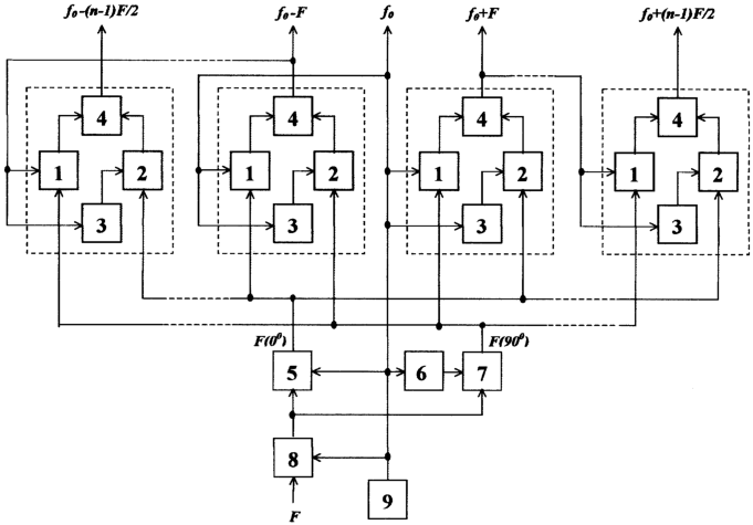 Выход f0 синусоидального генератора опорной частоты 9, являющийся выходом центрального канала МССЧ, соединен с опорными входами первых модулей справа и слева от центра линейного набора, со вторым входом первого смесителя 5, с входом второго 6 фазовращателя на /2 и с вторым входом синтезатора частоты 8. Выходы первых модулей справа и слева от выхода центрального канала МССЧ соединены соответственно с опорными входами вторых модулей справа и слева от центра, выходы вторых модулей справа и слева соединены соответственно с опорными входами третьих модулей справа и слева от центра и т.д. Выходы всех модулей справа и слева от центра являются выходами боковых каналов МССЧ соответственно с возрастающими эквидистантными частотами (f0+F,… f0+(n-1)F/2) справа и убывающими эквидистантными частотами (f0-F,… f0-(n-1)F/2) слева от выхода f0 центрального канала МССЧ. Выход F(0°) первого смесителя 5 соединен с вторыми квадратурными входами всех модулей справа и слева от центра, кроме первого модуля слева от цента, у которого этот выход соединен с первым квадратурным входом. Выход F(90°) второго смесителя 7 соединен с первыми квадратурными входами всех модулей справа и слева, кроме первого модуля слева, у которого этот выход соединен со вторым квадратурным входом. Выход второго 6 фазовращателя на /2 соединен со вторым входом второго смесителя 7. Первые входы смесителей 5 и 7 соединены вместе и с выходом синтезатора частоты 8, первый вход которого подключен к источнику частоты F интервала формируемой сетки частот (не показан).