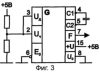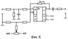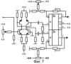 Большинство функциональных узлов отличительной части частотного модулятора выполняются на ИМС: элемент 2 НЕ – КР1533ЛН1, ключи 3 и 4 – КР590КН6, задающий генератор 10 может быть выполнен на ИМС КР531ГГ1 по схеме, представленной на фиг.3 (см. книгу: Бириков С.А. Применение интегральных микросхем серий ТТЛ. – М.: “Патриот”, МП “Символ-Р”, “Радио”, 1992. – 120 с. (Приложение к журналу “Радио”), с. 116); блок 11 предустановки может быть выполнен по схеме фиг.4 на транзисторах КТ3102Г; делители 12, 13 и 14 частоты на два могут быть выполнены на D-триггерах К1533ТМ2 по схеме фиг.5; формирователь напряжения пилообразной формы (ФНП) выполняется на интегрирующей RC-цепи с буферным каскадом на операционном усилителе, например, КР140УД8 по схеме фиг.6; формирователь напряжения синусоидальной формы (ФНС) выполняется по схеме фиг.7, в основу которой положена схема, представленная в книге: Граф Р. Электронные схемы: 1300 примеров: Пер. с англ. – М.: Мир, 1989, 688 с., ил., с.618.