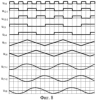 При включении напряжения питания генератор 1 формирует на своих выходах три напряжения синусоидальной формы одинаковой частоты =m /Т0, но с взаимным сдвигом по фазе на /2. Процесс формирования этих напряжений для случая m=1 поясняется осциллограммами фиг.8. Задающий генератор 10 формирует на своем выходе напряжение в виде меандра (осциллограмма u10) с тактовым периодом Т0/4m, где Т0 – длительность посылок входного модулирующего сигнала, m – целое число, равное желаемому индексу частотной модуляции. На выходах делителя 12 частоты на два получаются последовательности с тактовым периодом Т0/2m (осциллограммы u12-1 и u12-2), из которых делители 13 и 14 частоты на два формируют меандры с тактовым периодом Т0/m (осциллограммы u13 и u14).