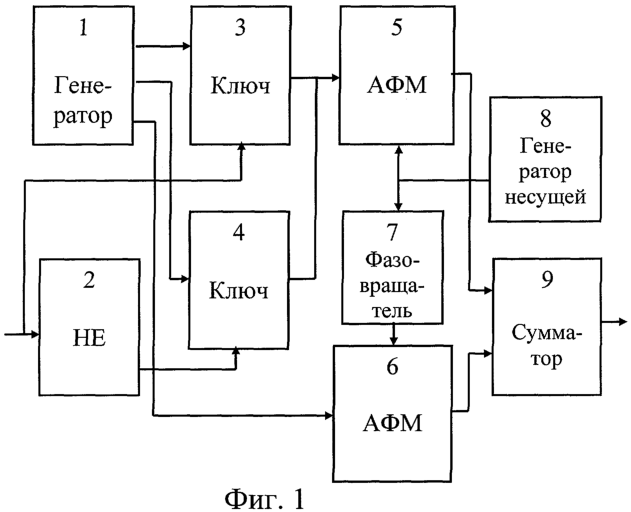 1. Частотный модулятор с целочисленным индексом модуляции, содержащий генератор несущей, фазовращатель, два амплитудно-фазовых модулятора и сумматор, причем выход генератора несущей соединяется с первым входом первого амплитудно-фазового модулятора и с входом фазовращателя, выход фазовращателя соединяется с первым входом второго амплитудно-фазового модулятора, выход первого амплитудно-фазового модулятора соединяется с первым входом сумматора, выход второго амплитудно-фазового модулятора соединяется со вторым входом сумматора, а выход сумматора является выходом частотного модулятора с целочисленным индексом модуляции, отличающийся тем, что в него включаются генератор, два ключа и элемент НЕ, причем первый выход генератора соединяется с сигнальным входом первого ключа, второй выход генератора соединяется с сигнальным входом второго ключа, выходы ключей соединяются со вторым входом первого амплитудно-фазового модулятора, третий выход генератора соединяется со вторым входом второго амплитудно-фазового модулятора, вход элемента НЕ соединяется с управляющим входом первого ключа и является входом частотного модулятора с целочисленным индексом модуляции, а выход элемента НЕ соединяется с управляющим входом второго ключа, причем выходные напряжения генератора имеют частоту =m· /To, определяющуюся необходимым целочисленным индексом модуляции m при длительности посылок Тo.