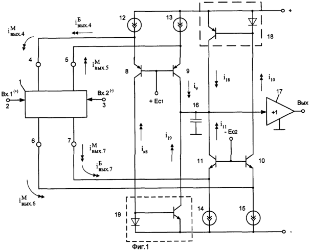 Операционный усилитель фиг.1 содержит входной каскад 1, входами которого являются узлы 2 и 3, первый (4) и второй (5) противофазные токовые выходы входного каскада, согласованные с шинами положительного источника питания, а первый (6) и второй (7) противофазные токовые выходы входного каскада согласованы с шиной отрицательного источника питания, т.е. могут иметь потенциал, близкий к +Еп (-Еп). Выходы 4 и 5 соединены с эмиттерами первого 8 и второго 9 р-n-р транзисторов с объединенными базами и выбранным на них напряжением смещения Ec1, а выходы 6 и 7 связаны с эмиттерами первого (10) и второго (11) n-р-n транзисторов с объединенными базами и выбранным на них напряжением смещения Ес2. Статический режим транзисторов 8-11 устанавливается двухполюсниками 12, 13, 14, 15. Коллекторы вторых n-p-n (11) и p-n-р (9) транзисторов соединены друг с другом и связаны с корректирующим конденсатором 16 и выходным буферным усилителем 17. Между коллекторами первого 8 и второго 9 р-n-р транзисторов, а также между коллектором первого 10 и второго 11 n-p-n транзисторов включены первый 18 и второй 19 повторители тока, общие узлы которых соединены соответственно с шинами положительного и отрицательного источников питания. В качестве входного каскада 1 применяются дифференциальные усилители, не имеющие ограничения выходного тока при изменении входного напряжения до нескольких вольт [5, 6].