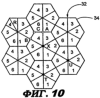Для многократного (повторного) использования частоты в известных беспроводных системах обычно требуется по меньшей мере одно кольцо из разделяющих сот. Обратимся за примером к фиг.5, где в известной системе имеются три частоты, используемые в сотах, что показано тремя разными штриховками. В конфигурации на фиг.5 сотовая система отделяет каждую соту, которая совместно использует один и тот же канал, установленный по меньшей мере одной сотой 32, для того чтобы минимизировать помехи, когда допускается использование одних и те же частот в другой части системы. В другой известной беспроводной системе для уменьшения частотных помех между сотами используется множественный доступ с временным разделением каналов (МДВР, TDMA). Обратимся за примером к фиг.6, где каждая сота 32 разделена на секторы 34, причем каждый сектор 34 имеет свой собственный частотный канал, при этом каналы повторяются в следующей соседней соте 32. Для обеспечения возможности повторного использования частоты применяется технология МДВР, что дает каждому пользователю уникальный временной интервал в канале. Так, в нижней соте 32, сектор 1, пользователь осуществляет передачу в соответствии с указанным сигналом дискретного времени, в соседней правой соте 32 пользователь осуществляет передачу в соответствии с указанным сигналом дискретного времени, то есть после того, как нижняя сота 32 выполнила передачу, а в соседней верхней соте 32 пользователь осуществляет передачу в соответствии с указанным сигналом дискретного времени, то есть после того, как соседняя правая сота 32 выполнила передачу, и так далее, так что каждый сектор в каждой соте выполняет передачу в разное время. Однако согласно настоящему изобретению из-за использования квадратурной фазовой манипуляции (КФМн) и уменьшенного диаметра каждой соты, как более подробно описано ниже, не требуется ни отделения сот 32, ни использования МДВР между сотами, смотри фиг.7.