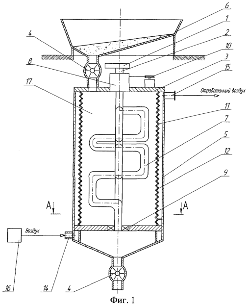 На фиг.1 схематично показана СВЧ-установка для сушки сыпучих материалов; на фиг.2 – разрез А-А.