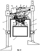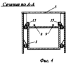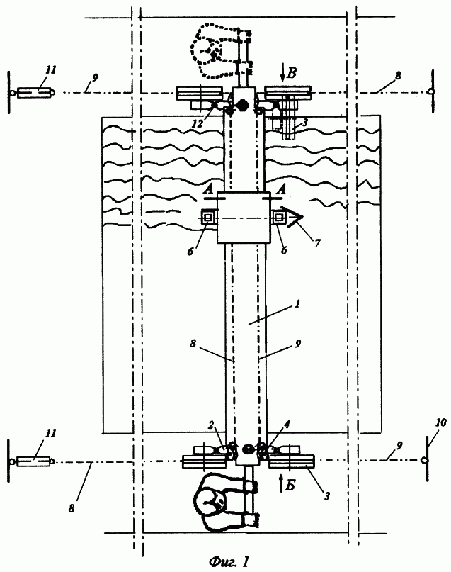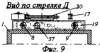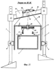 На фиг.11 показан разрез мостового агрегата по каретке 5. В центре верхней плоскости каретки 5 установлена ось 28, на которой закреплена свободно вращающаяся на ней планка 29, которая, в свою очередь, соединена с одной из линий гибкой связи 17. В верхней части каретки 5 на раме 30 установлено свободно вращающееся на оси 31 коромысло с лотком 32, в котором помещен груз 33, имеющий возможность свободного перемещения.