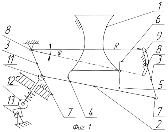 Форма бункера 1 позволяет создать в нижней его части разгрузочную камеру, которая предотвращает сгруживание высеваемого материала. Высеваемый материал самотеком через выпускное окно 5, размер которого задается перемещением регулируемой заслонки 6, поступает из бункера 1 на затвор 2. В это время кулачки многокулачкового толкателя 13 через ролик 12 воздействуют на подпружиненную вилку 11, которая в свою очередь воздействует на ось 10 нижних шарниров 7 затвора 2 и придает колебательное движение всему затвору 2. Перемещая верхние шарниры 8 подвесок 3 затвора 2, приближенных к выпускному окну 5, можно изменять угол наклона затвора 2 от 0° до угла трения семян о его поверхность. Невозможность установки большего угла наклона затвора 2 предотвращает самопроизвольное истечение высеваемого материала. По номограмме типичных режимов движения высеваемого материала по затвору 2 выбирают необходимую частоту вращения роторного толкателя 13 и угол наклона затвора 2 к горизонту. Выбор различного сочетания данных параметров позволяет получать широкий спектр режимов движения высеваемого материала по затвору 2, что в свою очередь обеспечивает возможность создания потока высеваемого материала необходимой равномерности и интенсивности (нормы высева).