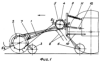 Копирование неровностей рельефа поля колесом 3 и, следовательно, подбирающим барабаном 2 обеспечивается за счет поворота в небольших пределах рамы 1 оборачивателя на шарнирах продольных нижних тяг 10 и удлинения-укорочения подпружиненной верхней тяги 11 навесной системы. При этом длина L тяги 11 устанавливается такой, чтобы ограничитель хода 40 находился посередине прорези 42, то есть обеспечивалась возможность копирования как возвышений, так и впадин рельефа поля. Нагрузку на копирующее колесо 3 регулируют при помощи пружины 39 таким образом, чтобы колесо 3 и вместе с ним барабан 2 не подпрыгивали на неровностях рельефа поля и в то же время колесо не утопало и не зарывалось в почву.