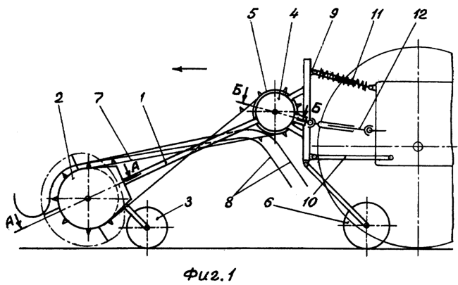 Верхняя тяга 11 состоит из соединенных телескопически наружной 35 (фиг.4) и внутренней 36 труб, левого 37 вращающегося относительно трубы 35 наконечника и правого 38 вкручивающегося в трубу 36 резьбового наконечника, а также уравновешивающей пружины сжатия 39 и ограничителя хода 40, соединенного жестко с внутренней трубой 36 при помощи стопора 41. За счет перемещения внутренней трубы 36 в наружной 35 тяга в небольших пределах, ограничиваемых прорезью 42 наружной трубы, может по мере копирования рельефа поля подбирающим барабаном менять свою длину. Происходит это при заданном усилии, создаваемом уравновешивающей пружиной 39 и регулируемой гайкой 43. Благодаря этому обеспечивается оптимальная нагрузка на копирующее колесо 3 подбирающего барабана 2. Необходимая рабочая длина L тяги устанавливается путем накручивания ее при помощи воротка 44 на правый резьбовой наконечник 38.
