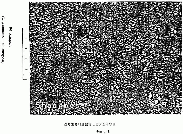 Как показано на Фиг.1, традиционные, коммерчески доступные натамициновые композиции содержат много больших частиц произвольной формы. Обычно средний диаметр частиц в таких традиционных, коммерчески доступных натамициновых композициях находится в пределах от 10 до 60 микрон. Меньших размеров частиц избегают, так как для получения натамицинового материала со средним диаметром частиц 10 микрон или меньше требуются особые способы обработки и потому, что такие маленькие частицы (10 микрон в диаметре или меньше) при хранении в сухом виде склонны к агломерации с образованием частиц большего размера.